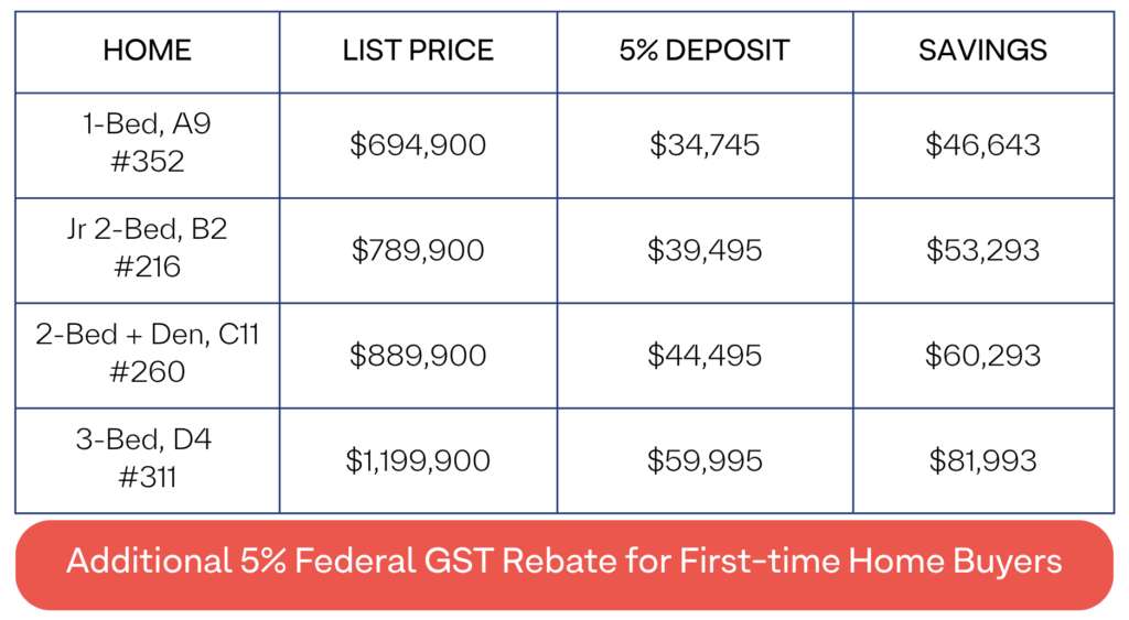 First-Time Home Buyers (FTHB) GST Rebate are processed through the federal government. The developer does not administer the rebate program. Eligibility requirements apply.